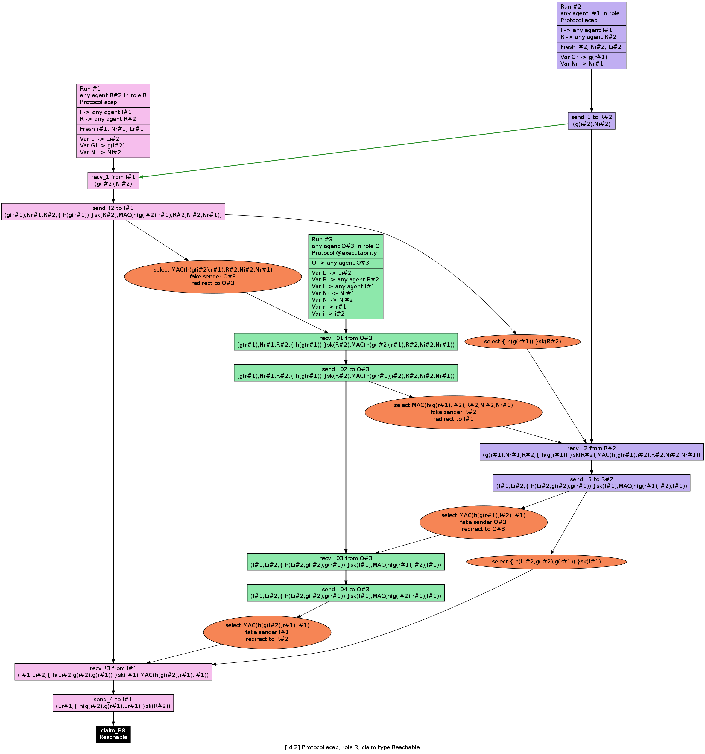 $ cd scyther $ wget public.tel.fer.hr/acap/acap.spdl $ src/scyther-linux -c -r 3 acap.spdl claim acap,I Reachable_I8 - Ok [at least 1 variant] claim acap,R Reachable_R8 - Ok [at least 1 variant]Scyther can also produce a nice output by using the dot format. The output of this verification (after transforming dot to png) is shown in the following figures: The final verification step can be done by using the following script. The script takes the number of runs as the first argument and sequentially checks whether all defined claims are satisfied. Sample code for unbounded verification (runs=0), and the verification results are shown below. NOTE: Unbounded verification can take a really long time (up to 3 days) depending on the resources available. It is advised to use a smaller amount of runs (3, 4 or 5) for testing.